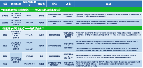 卡瑞利珠单抗联合AG亚游集团医药的另一款创新药法米替尼在甲状腺癌和结直肠癌领域有2项研究被接收为壁报,另有卡瑞利珠单抗联合化疗的4项研究在肺癌、结直肠癌、头颈癌和阴茎癌领域的研究被接收为5份壁报。