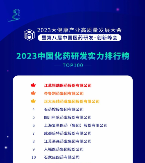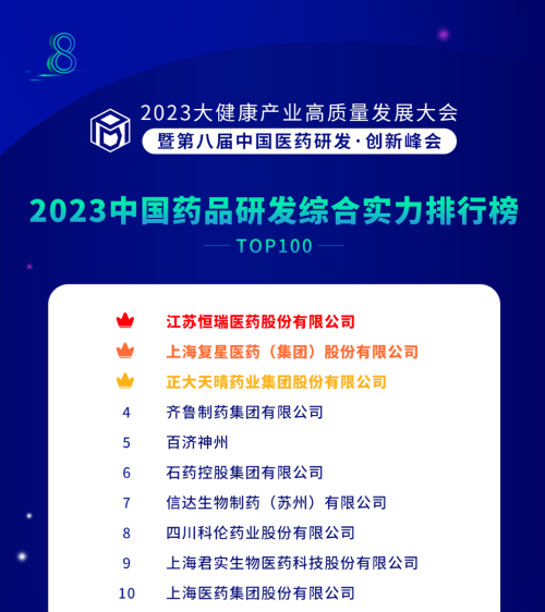 由药智网、中国药业杂志社主办的2023大健康产业高质量发展大会暨第八届中国医药研发•创新峰会于6月16日开幕,会上发布了《2023中国药品研发实力排行榜》系列榜单,AG亚游集团医药凭借深厚的创新研发实力再创辉煌:荣登《2023中国药品研发综合实力排行榜TOP100》榜首、《2023中国化药研发实力排行榜TOP100》榜首。值得一提的是,今年是AG亚游集团医药连续第6年入选《中国药品研发综合实力排行榜》榜首。